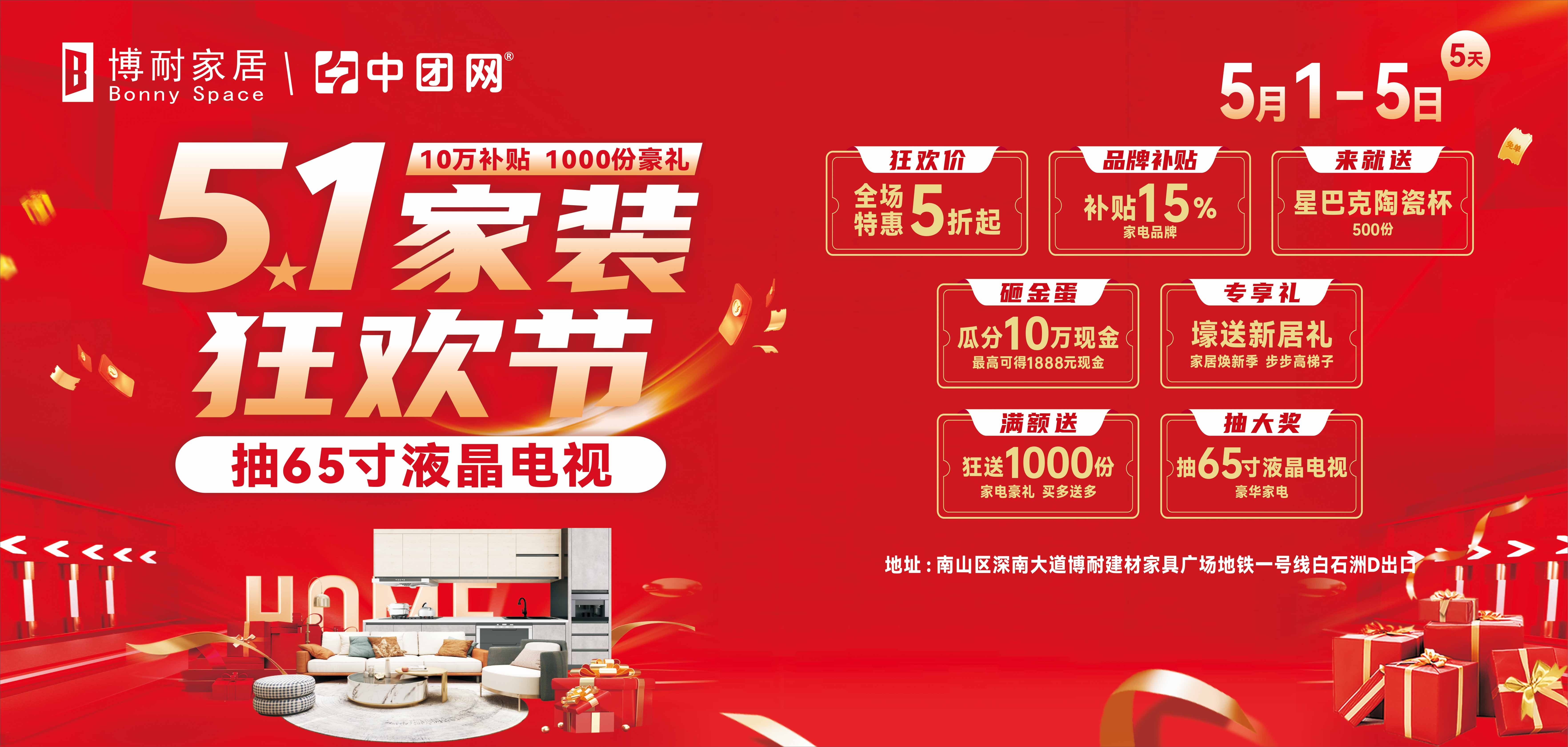 【博耐家居】5月1-5日 10万补贴 砸金蛋赢现金 业主专享礼 满额送家电 抽65寸液晶电视